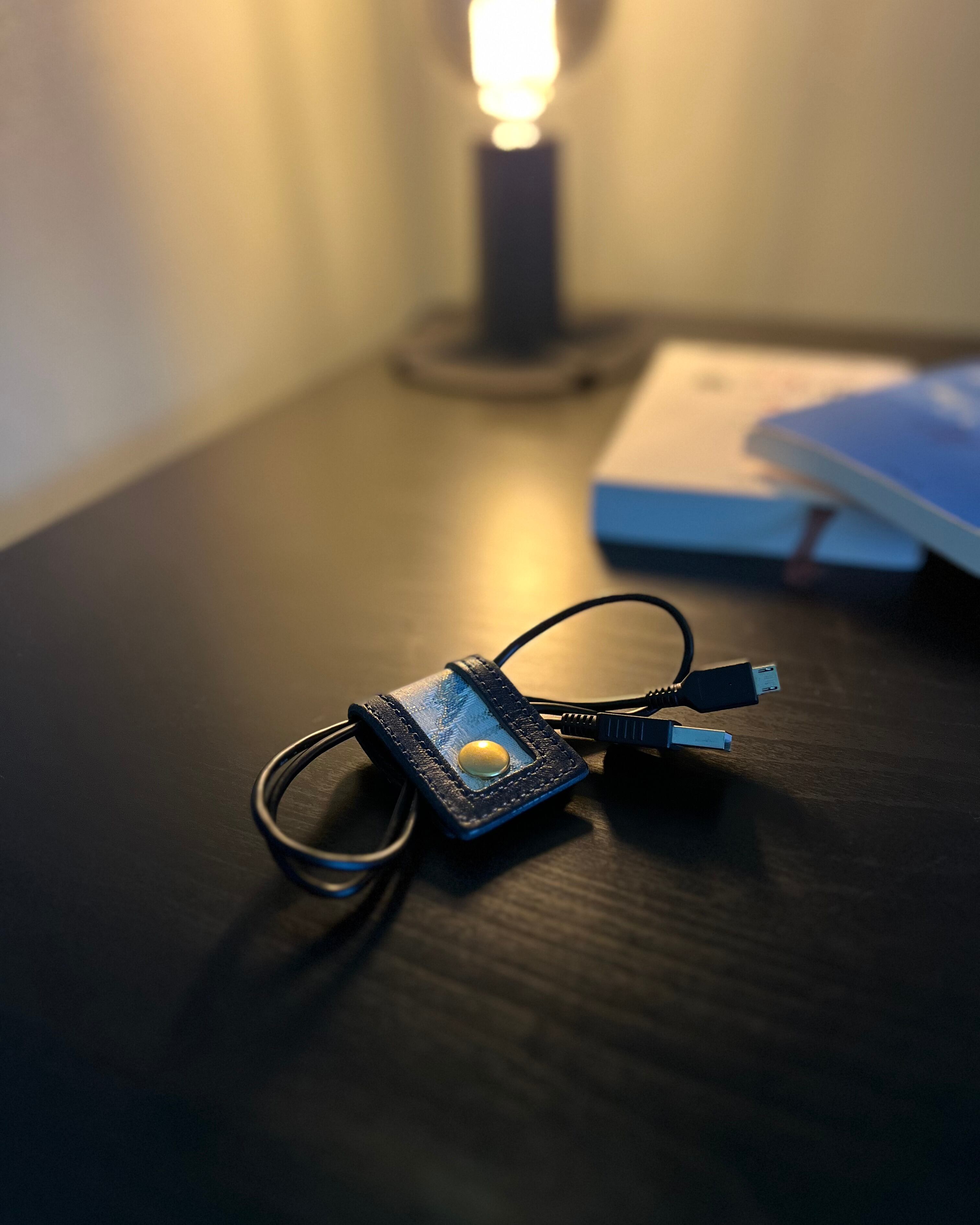Crafted from rich, deep navy genuine leather, this cord holder exudes calm elegance and refined quality. Its understated yet unmistakable presence adds a quiet beauty to your everyday routine.
