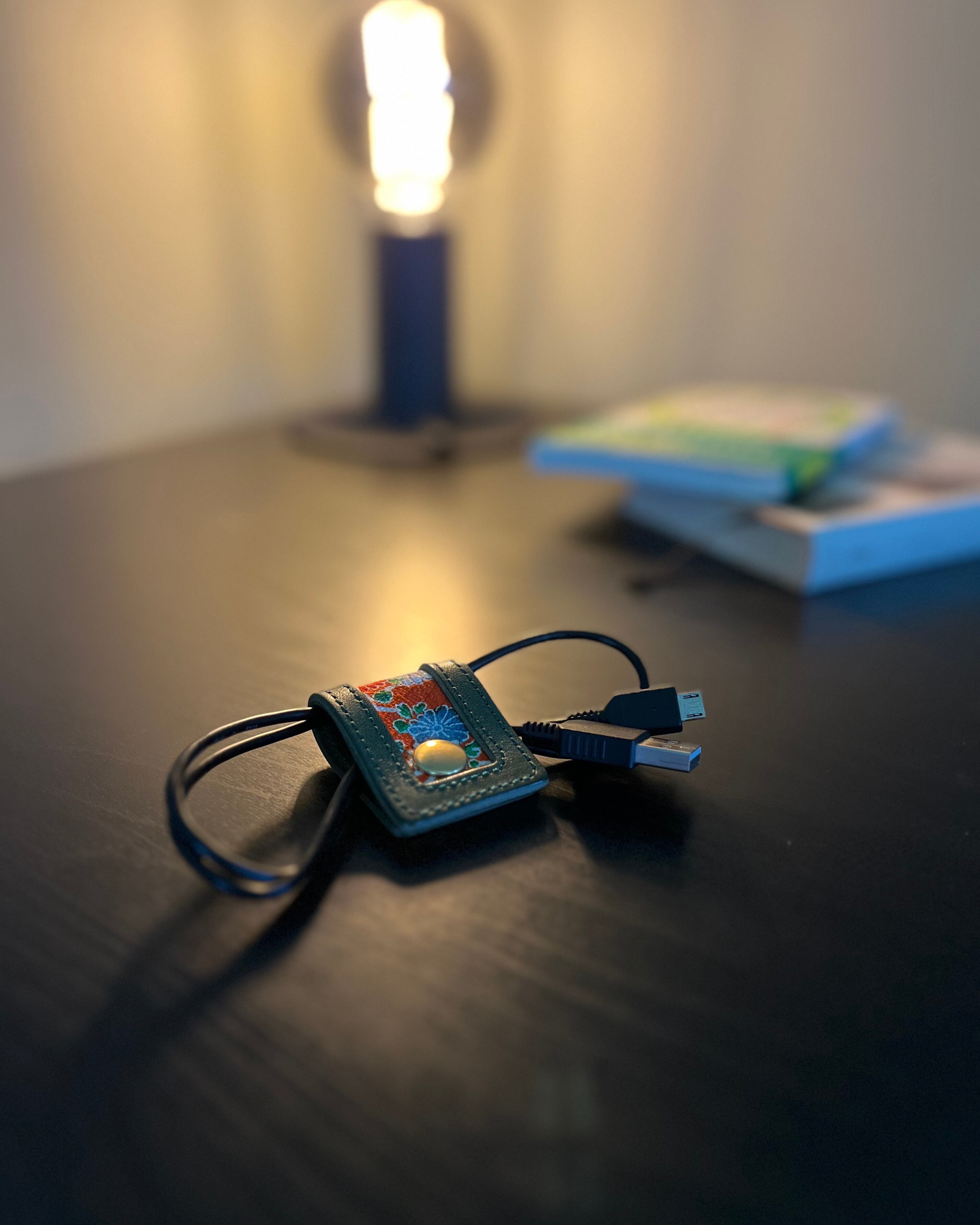 This adorable cord holder features a calm deep green genuine leather base, paired with a bright and cheerful orange accent adorned with chrysanthemum flowers. The elegant Japanese motif and its comforting color palette add a touch of delight to your everyday life.