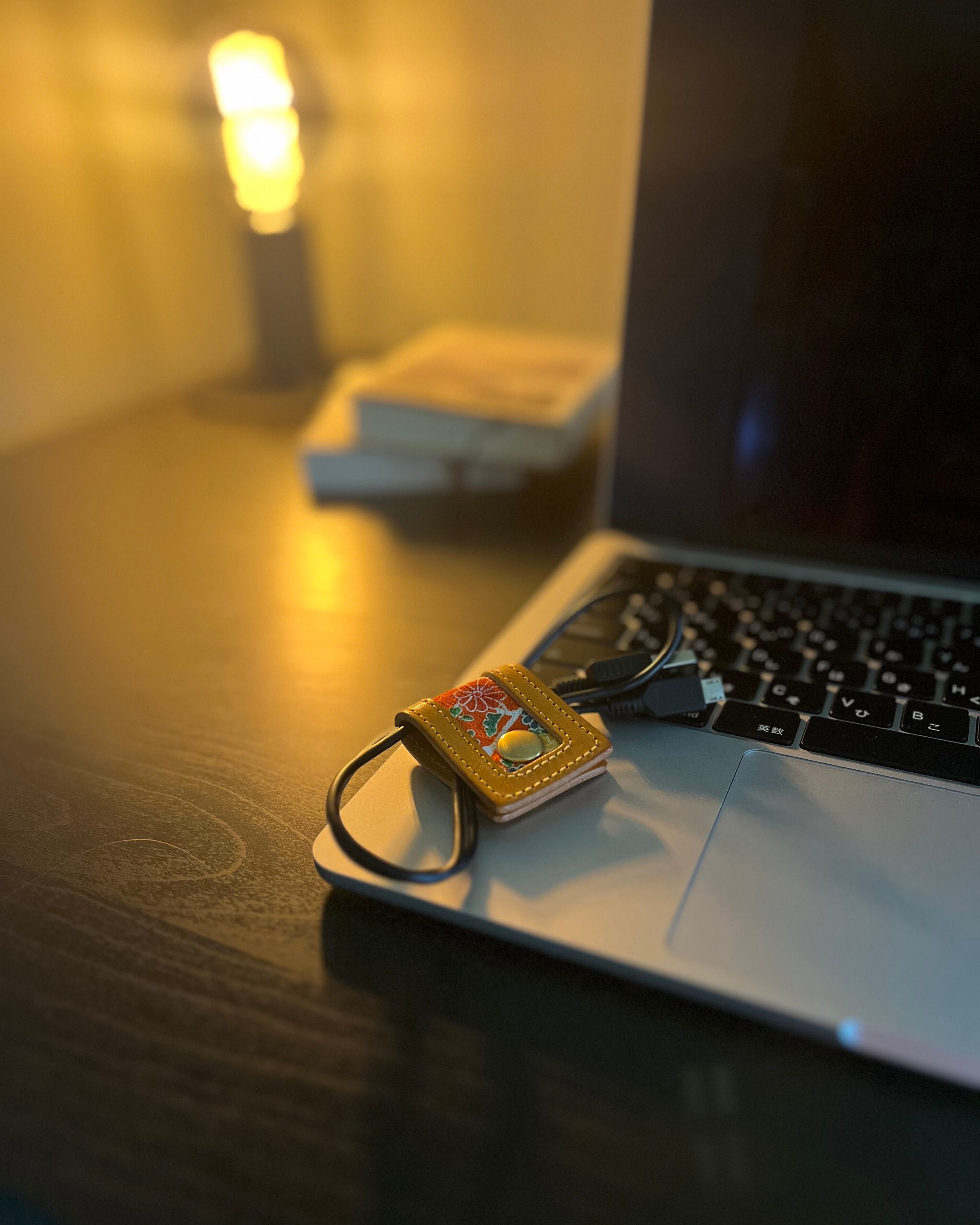 This soothing cord holder features warm light brown genuine leather, accented with a cheerful orange fabric adorned with charming chrysanthemum flowers. The gentle colors and floral design bring a touch of everyday joy and comfort to your life.