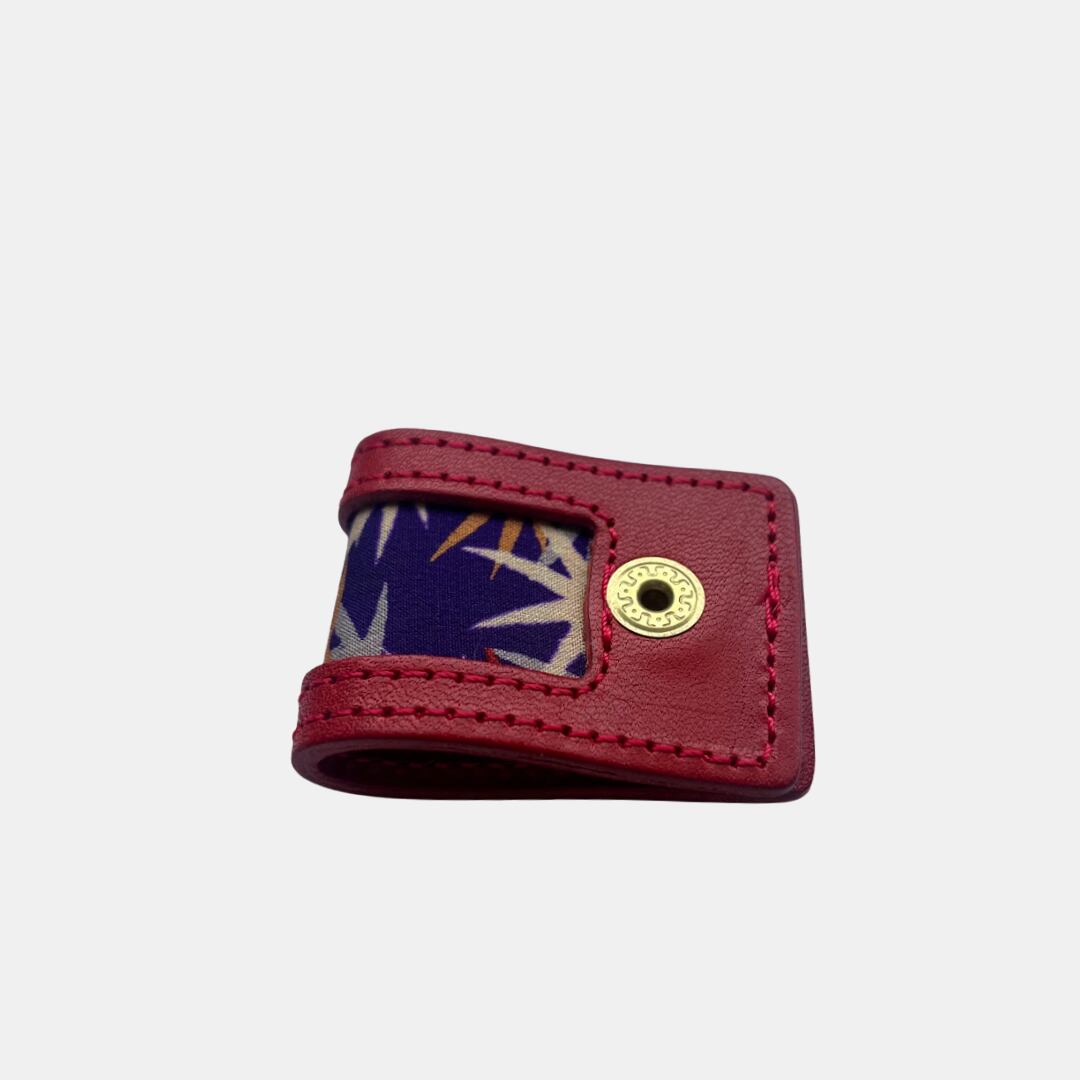 やわらかな艶をたたえた赤の本革に、青みを帯びた地に映える紅葉柄があしらわれたコードホルダー。