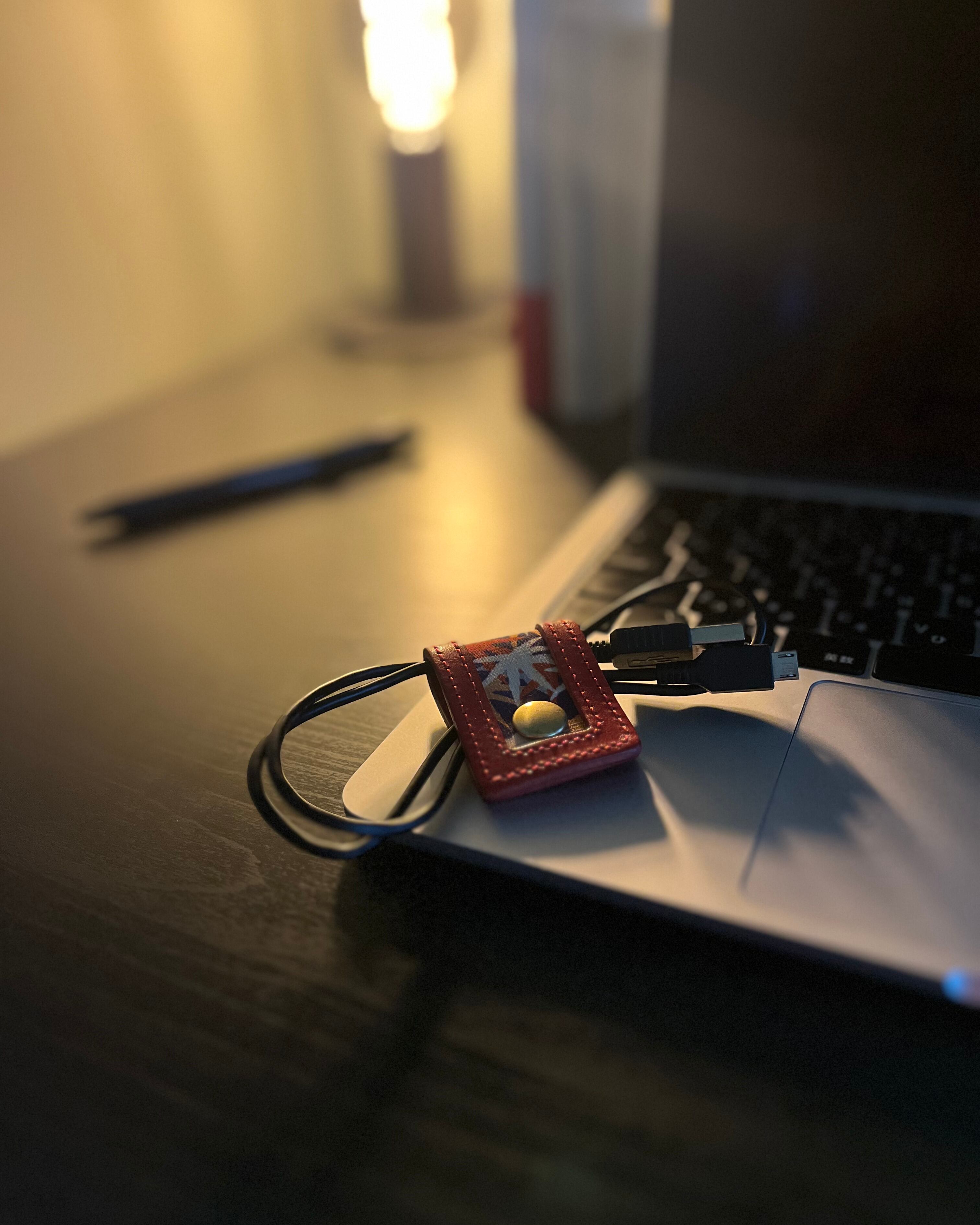 This cord holder is crafted from soft-gloss red genuine leather, accented with a maple leaf design that stands out gently against a cool-toned background. The subdued color palette offers a delicate balance—bright yet calm, elegant yet understated.